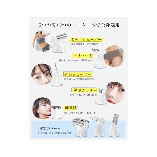 【全身用5in1多機能シェーバー】全身適用のレディースシェーバーはボディシェーバー、トリマー刃、眉毛シェーバー、鼻毛カッター、回転刃の5種類交換ヘッドが付属し、1台だけで5役の機能を備えます。眉、小鼻や細かい部分からvioゾーンまで徹底的に!ビキニライン、デリケートゾーン、顔、脇、足、腕などの全身のムダ毛処理が簡単になります。脱毛サロンは料金が高い、カミソリは毛が生えやすい、クリームはアレルギーの可能性が高い、これ1本でこんな悩みから解放!全身に使えるセットでお得感満載!
