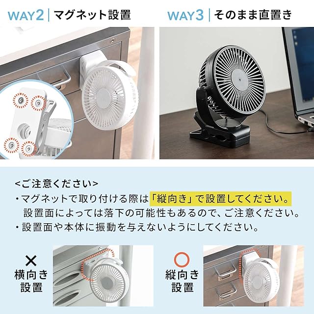 商品名:サンワダイレクト USB扇風機 充電式 マグネット/クリップ/直置き 設置 3段階風量 タイマー付き 360° 静音 ブラック 400-TOY039BK