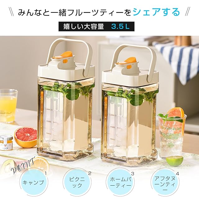 【嬉しい大容量3.5リットル】家族や友人との集まりに最適な大容量3.5L(7本*500MLミネラルウォーターに相当)。ホームパーティーやアウトドア活動での自家製フルーツティーや麦茶の提供に適しています。