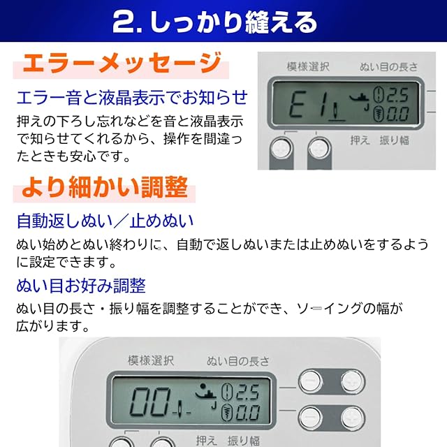 ■その他:主な機能■液晶ディスプレイ/らくらく模様選択/ドロップフィード/段差縫いに便利な固定ピン付き押え/LEDデュアルライト/ゆっくりぬい機能/ゆっくりスタート/針停止位置設定/一針縫い/筒縫いに便利なフリーアームつき