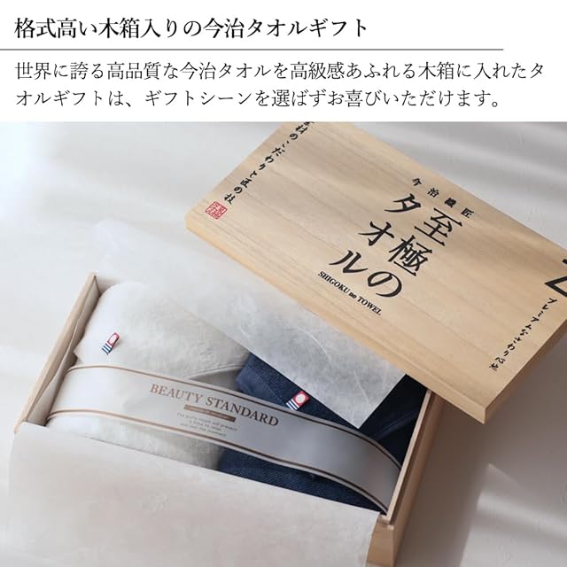 清楚な白とシックなネイビーを組み合わせたフェイスタオル今治タオルのギフトセット。 木箱に入っており、高級感あふれる贈り物です。