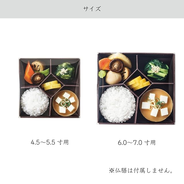 内訳/ご飯、吸い物、おかず、和え物、漬物 各1 材質/PVC製 ※お供え料理セットはイミテーションです。食べることはできません。 ※仏膳はついておりません。