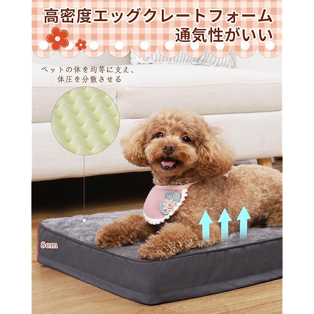 【高反発ペットベッド】犬ベッドの中には厚さ8cmの高密度エッグクレート・フォームで、凹凸の点で体を支えて、体圧分散が均等に行われ、高齢犬や子犬などにオススメです。長時間使用しても型崩れしなく、猫やその他の小動物用クッションとしても使えがあるペットが快適に休むことができるペットベッドです。