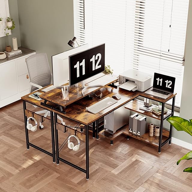 【ゲームと仕事両立】L字ゲーミングデスクは実用性が高く、ゲームプレイ、在宅勤務、勉強机、書斎机など様々なシーンで大活躍!お部屋のレイアウトに合わせてラックの位置を変更できます。モニター台を利用し、目線をあげて作業時の姿勢を改善し、テレワークが快適になり、作業効率も格段に上がります。