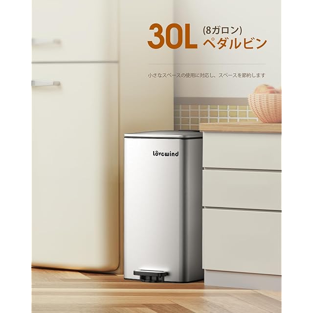 商品名:Lovewind 蓋付きキッチンゴミ箱、30L 足踏み式ゴミ箱 キッチン 寝室 ホームオフィス用、30リットル ステンレススチールゴミ箱 ソフトクローズ蓋付き、シルバー
