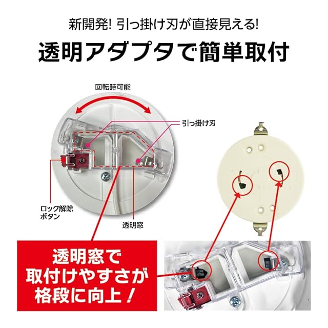 引っ掛け刃が直接見える透明窓で取付やすさを実現。アダプタ本体単独で回転可能。刃やコンセントの破損を防ぎます。