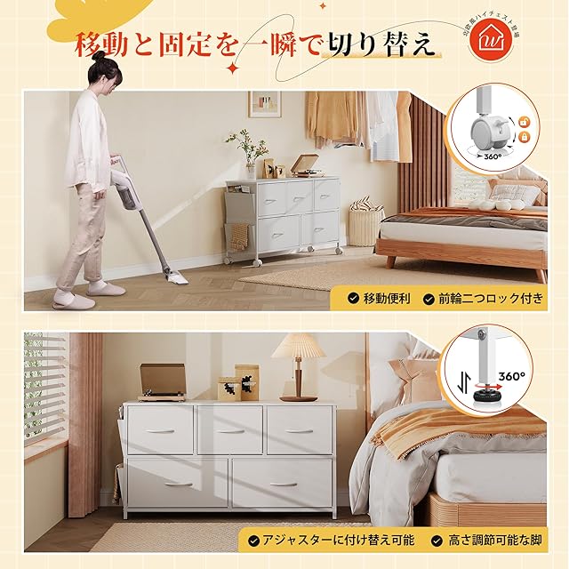 WLIVE チェスト タンス キャスター付き サイドポケット付き 2段5杯 箪笥 ローチェスト リビング収納 おしゃれ 収納チェスト 布製 引き出し 大容量 洋服タンス 衣類収納 北欧 シンプル ホワイト ASNG607