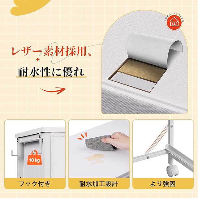 4.頑丈構造&耐久性高い: スチールフレーム構造により、製品はより頑丈になり、長期間使用できます。天板は30kgの重量を支えることができます。天板は30kgの重さに耐え、各引き出しは2.5kg、サイドポケットは5kg、フックは5kgの重さを支えます。天板はエンボス加工の木製材料を使用し、キズ付きにくく、耐水性に優れています。引き出し面にはレザー素材を使用し、防水性が高く、高級感があります。質感のある取っ手は使いやすく、引っ張りやすいデザインです。