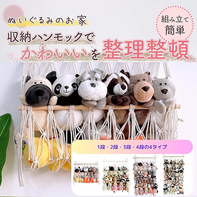 ぬいぐるみたちを、可愛く収納する「ぬいぐるみ用の収納ハンモック」です。お部屋をスッキリと整えながら、大切なぬいぐるみたちを飾りませんか。