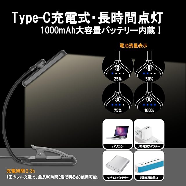 【Type-C充電&大容量1000mAh】Type-Cポート搭載で、より速く安全に充電可能。1000mAhの大容量バッテリーを搭載し、1回のフル充電で最長80時間(最低明るさ)使用可能。頻繁に充電必要なし!