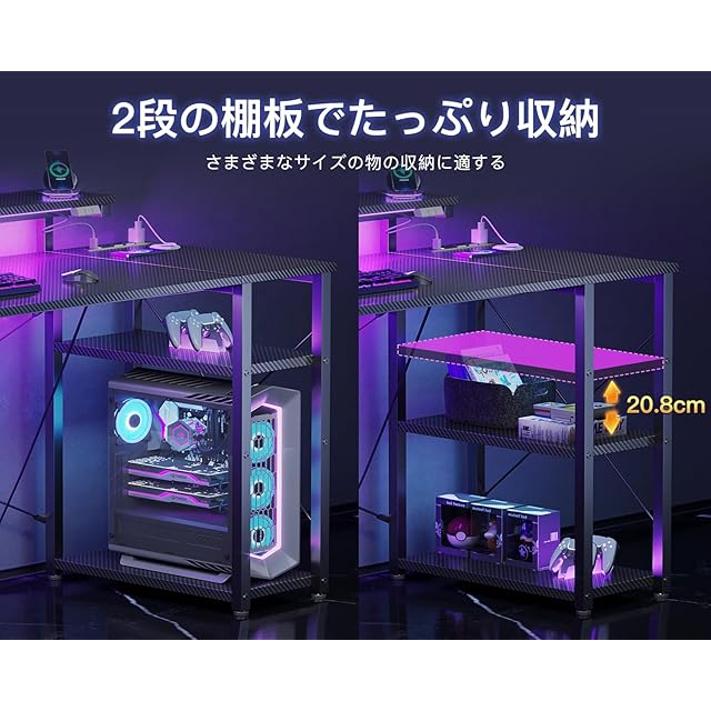 AODK ゲーミングデスク パソコンデスク ラック&コンセント付き 幅100cm 机 pcデスク ゲームデスク gaming desk モニター台&LED付き ゲーミングテーブル 左右入れ替え対応 カーボン調ブラック