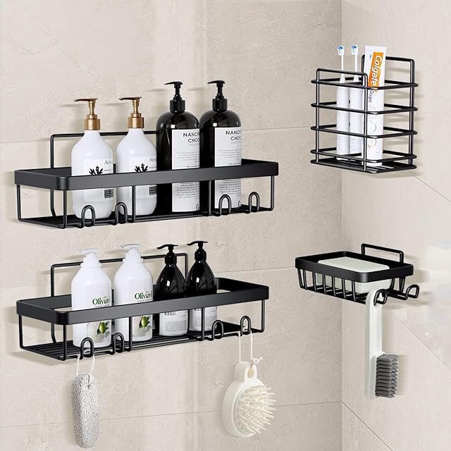 EmJTao 浴室ラック 4セット強力粘着固定 合金钢お風呂ラック 穴あけ不要シャワー 水切りお風呂収納 バスルームの収納やインテリアに最適 (ブラック)