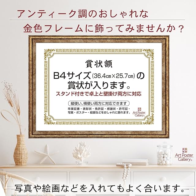 【特徴1】金色のアンティーク調の額縁です。コンクールや大会で得た賞状や表彰状・卒業証書・免許証・感謝状・功労賞・認定書・修了書などをおしゃれに飾れます。また写真・絵画・ポスターなどにもよく合います。