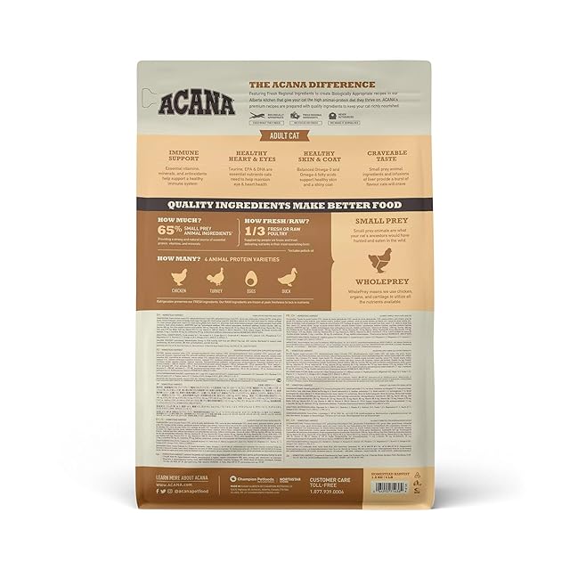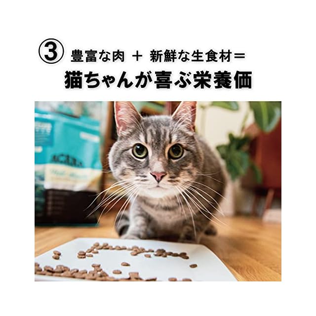 新鮮鶏肉(17%)、ディハイドレート鶏肉(15%)、ディハイドレート七面鳥肉(13%)、ホールオーツ、丸ごとエンドウ豆、鶏脂肪(7%)、丸ごと緑レンズ豆、丸ごとヒヨコ豆、丸ごと赤レンズ豆、巣に産み落とされた新鮮卵(4%)、新鮮七面鳥肉(4%)、レンズ豆繊維、ポロック油(1%)、新鮮鴨肉(1%)、鶏軟骨(1%)、新鮮鶏内臓(レバー、心臓) (1%)、新鮮七面鳥内臓(レバー、心臓)(1%)、乾燥ケルプ、新鮮丸ごとバターナッツスクワッシュ、新鮮丸ごとカボチャ、新鮮丸ごとクランベリー、新鮮丸ごとブルーベリー 酸化防止剤:天然成分から抽出したトコフェロール 添加栄養素(1kg中):塩化コリン1200mg,タウリン400mg,亜鉛(アミノ酸水和物の亜鉛キレート)150mg,ビタミンB1 25mg,ビタミンB2 10mg,ナイアシン50mg,ビタミンB5 8mg,ビタミンB6 7.5mg,葉酸0.75mg,ビオチン0.03mg,ビタミンB12 0.1mg,,ビタミンA 1850IU,ビタミンD 250IU,ビタミンE 175IU,銅(アミノ酸水和物の銅キレート)11mg,L-カルニチン50mg,DL-メチオニン99mg 添加腸球菌:エンテロコッカス・フェシウム菌