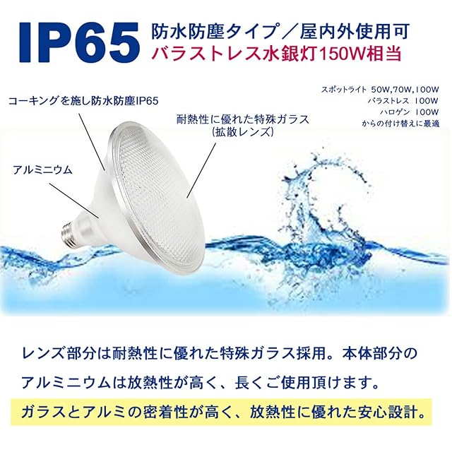 【特徴】 ●防水性能:IP65の防水等級なので、屋内,屋外兼用タイプです。 ●水銀灯代替:PAR38 LEDでビーム球を完全再現! ●適用場所:工場・倉庫などのスポット照明や看板照明にスマートチョイズ。 ●省エネ・長寿命:うちのLED電球は伝統的な白熱電球より約80%消費電力をカットします。設計寿命約50,000時間により維持費を大幅に削減します 。 ●有害物質(水銀)、UV放射がなくて安心で使われます。 ●従来のバラストレス水銀ランプに比べ、交換作業が大幅に省けます。