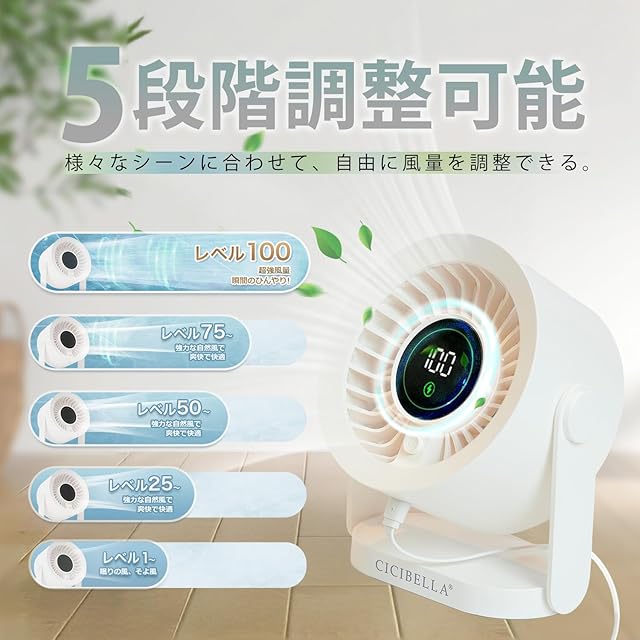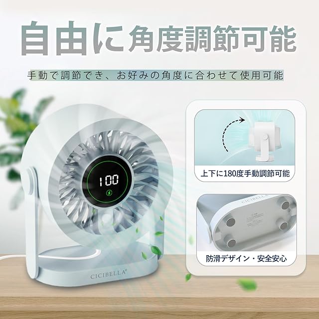 商品名:卓上扇風機 小型 USB給電式 DCモーター搭載 【静音設計&100段階風量調整】 サーキュレーター デスクファン 無段階風量調整 タイプC給電 液晶ディスプレイ付き 扇風機 卓上ファン 角度調整可能 コンパクト オフィス 書斎用