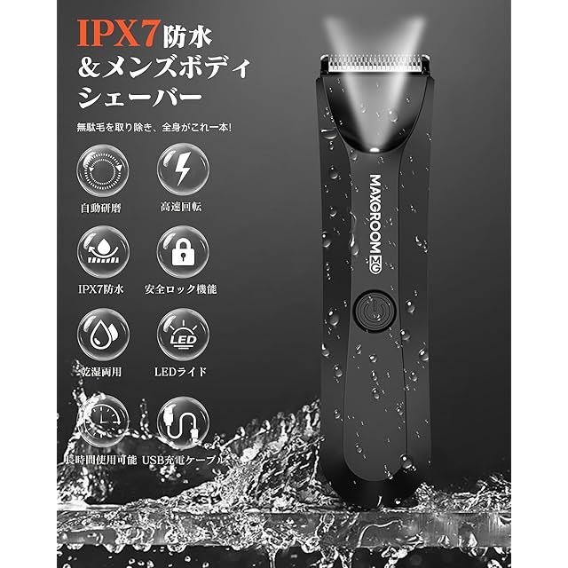 商品名:ボディシェーバー メンズ vio 電動シェーバー 電気 USB 充電式 全身 ボディ トリマー 自動研磨 IPX7防水 お風呂剃り可 LEDライト 男性用 電動バリカン 水洗い可 安全ロック機能 使用可3mm、6mmの2種類の付属コーム付き 軽量 プレゼント