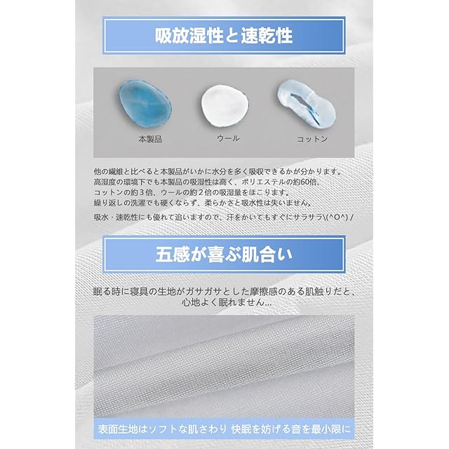 極上の寝心地、クール 絹のような滑らかさ、絹のような光沢がおしゃれ ソフトな肌ざわりで快眠を妨げる音を最小限に 保温性、吸湿性 防臭、抗菌、防ダニ