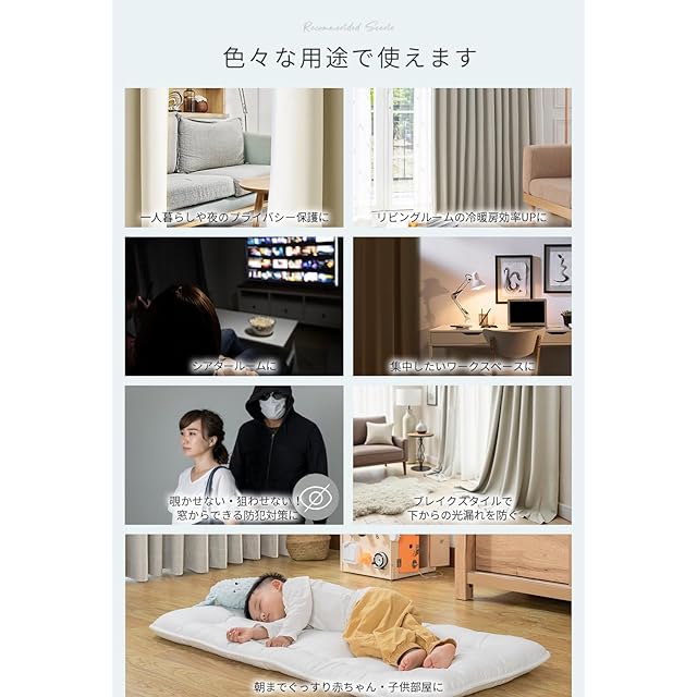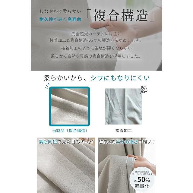 【遮光率100%・完全遮光カーテン】本製品は生地の間にブラックフィルムを挟んだ三層構造により、淡い色でも遮光1級(99.99%)を超える100%完全遮光を実現!睡眠、映画鑑賞、赤ちゃんのお昼寝、プライバシー対策に最適。床まで届く丈を選べば、光漏れも心配ありません。リビング、寝室、子供部屋など、さまざまな空間で重宝するカーテンです。床までしっかり届く丈を選べば、気になる光漏れも防げます。