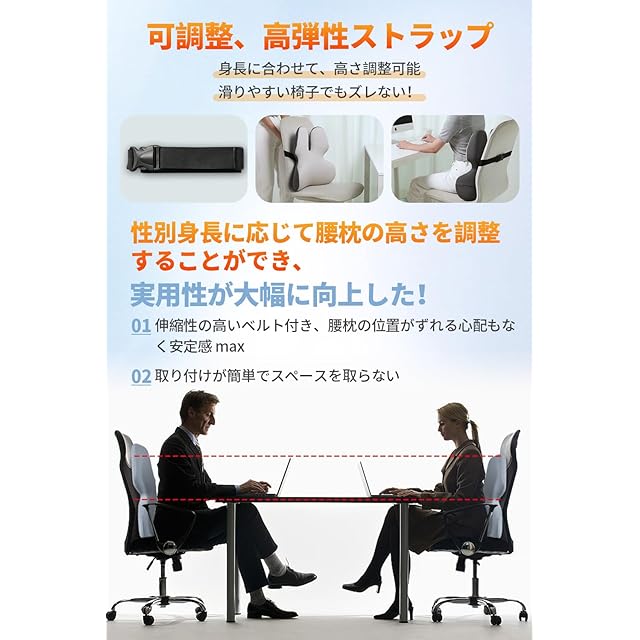 【さまざまな場合に適用 実用的な贈り物 丸洗いOK!】760gの軽量で持ち運びが便利です。背もたれには調節可能なストッパーが付いているので、ご自宅や職場の椅子や車のシートにしっかりと固定できます。旅行、オフィス、勉強、長時間の座り仕事、長時間の労働におすすめです。ご友人やご家族、ご年配の方へのプレゼントにも最適です!この腰枕は洗濯可能です。カバーを洗濯の際、色移りするものとは一緒に洗わないでください。