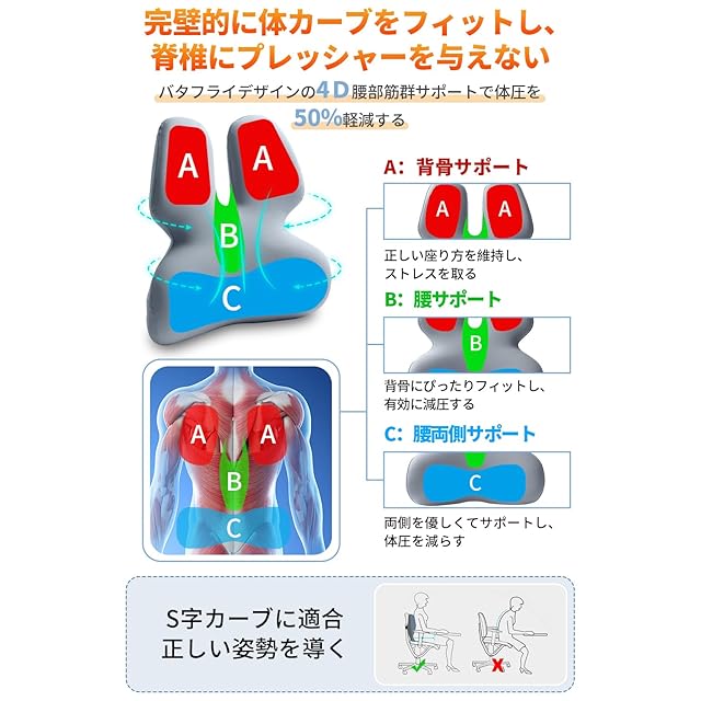 【人間工学に基づく 科学的なエリア 正しい座り姿勢に導く】一見シンプルな腰枕は、科学的なデザインで、背中全体が快適でリラックスできます。バタフライデザインの4D腰部筋群サポートは、肩甲骨、背骨、尾骨の部位の圧力を分散し、圧力を50%軽減します。人間工学に基づいて設計され、背骨のS字カーブに適合し、正しい姿勢で優しくホールドするように設計されています。体圧を両方向に分散し、両側がお腰を優しく包み込んで、尾骨部の圧力が分散され、お尻まで背中全体を楽にします。(注:この製品は、既存の腰の病気を治療することはできません。)