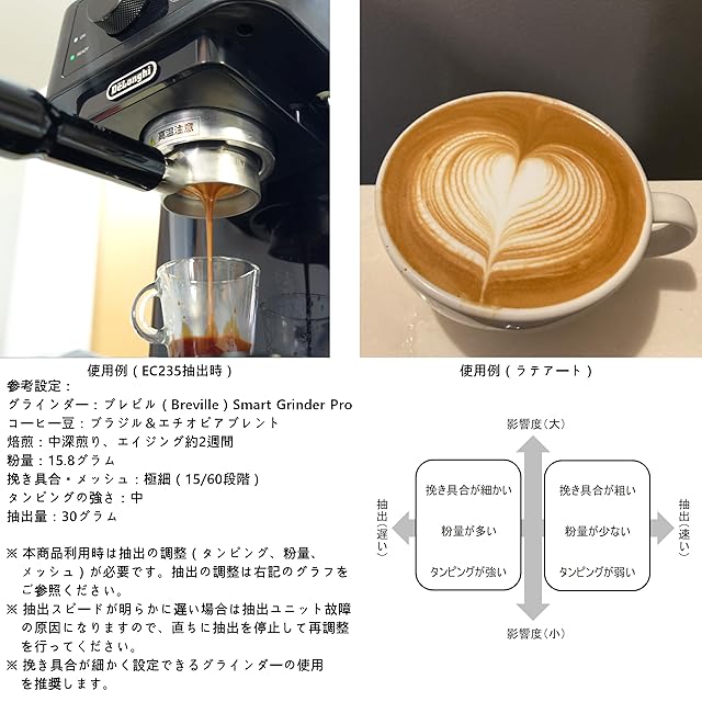 本物のクレマを味わいたい方におすすめです。 ボトムレスフィルターへ交換することで、下記のメリットがあります: ・正確な抽出状況を把握できる ・増幅弁の「泡」から本物のクレマを抽出可能に ・ポルタフィルタ底部やスパウトに触れないため、フレーバーが影響されない ※当該商品の使用に当たってある程度のコーヒー知識が必要になります。抽出時の飛び散りは商品品質上の問題ではなく、チャネリングが発生していることになります。粉の量、挽き加減、タンピングの調整を行ってください。※フィルターバスケットは消耗品になります。抽出、タンピングの圧力によって変形が発生し、抽出に影響を与える可能性がありますので、半年~一年を目安に交換を推奨します。