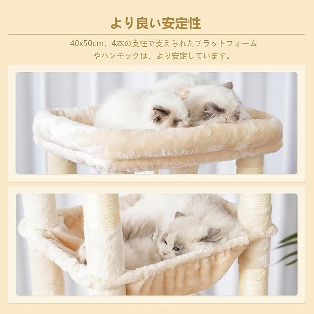 【安定性】厚みのある底板と、転倒防止装置を併用しており、キャットツリー全体が安定しています。4本の柱で支えられている見晴らし台とハンモックは、1本の柱で支えられている猫用ベッドよりも安定性が高まります。