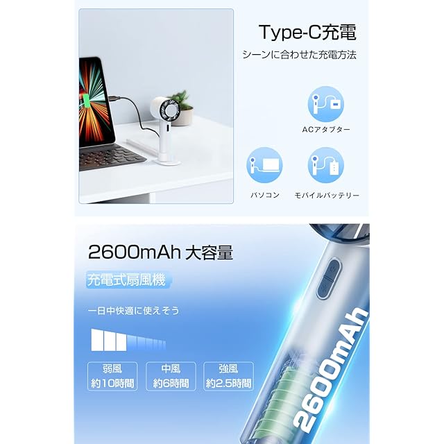 ④ 【携帯・卓上両用デザイン&スマホ置き対応】 手持ち扇風機としてだけでなく、卓上扇風機としても使える2WAYタイプ。さらにスマホスタンドとしても使用可能で、オフィスや動画鑑賞中にも便利!スタンド付属&ストラップ⑤ 【小型・軽量ボディ&Type-C充電対応】 重さわずか約200gの扇風機 小型設計で、カバンに入れてもかさばらず外出に便利。Type-C対応で急速充電も可能。通勤・通学・旅行・アウトドア・花火大会など、あらゆる場面で活躍する携帯扇風機です。長時間使用可能な充電式で、ハンディ ファン おすすめアイテムとしても人気上昇中!付きで持ち運びにも最適。usb 扇風機としてPCやモバイルバッテリーでも簡単に充電できます。小型扇風機ながらパワフルで安定性抜群!