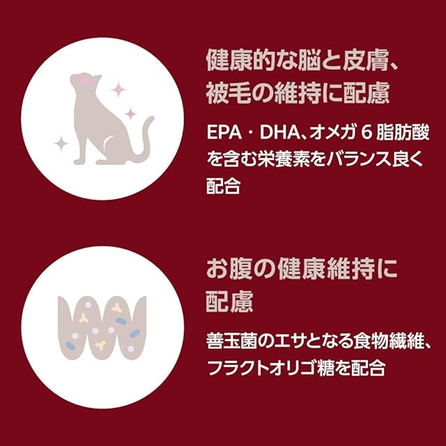 室内で暮らす成猫の「毎日の健康維持」に。ビタミン、アミノ酸、必須脂肪酸などを理想のバランスで配合し、毎日の健康をサポート。 ◆健康的な脳と皮膚、被毛の維持に配慮◆ EPA・DHA、オメガ6脂肪酸を含む栄養素をバランス良く配合。室内で暮らす成猫の健康的な脳と皮膚、被毛の維持をサポートします。 ◆お腹の健康維持に配慮◆ 腸内フローラを整えるため、善玉菌のエサとなる食物繊維(セルロース、サイリウム)、フラクトオリゴ糖を配合。さらに消化吸収の負担が少ない小麦タンパク質分離物(消化率90%以上)、ジャスミンライスを使用し、室内で暮らす成猫のお腹の健康維持をサポート。 ◆毛玉に配慮◆ 原材料に食物繊維(セルロース、サイリウム)を配合することにより毛玉の排出を助けます。 ■更新日時:2025/06/24 10:35:08