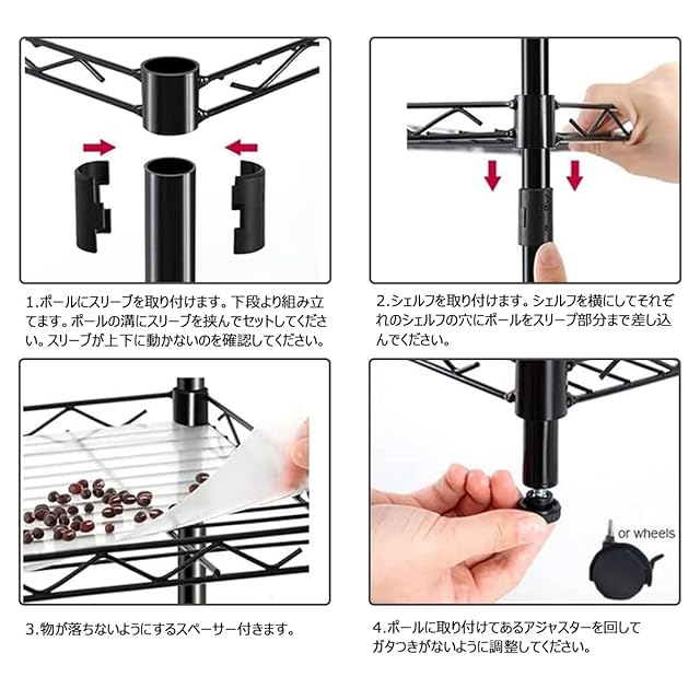 便利性:棚の位置は、収納物に合わせて自由に変えることが可能です。移動に便利なキャスターと常設用としてアジャスター付きます。
