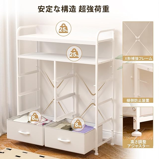 【強度が高い構造で安定&安全のチェスト】1.5CM*1.5CMでのフレームやX字補強ワイヤー構造で安定感がUP!まだ壁固定具付きで揺れを軽減できます。