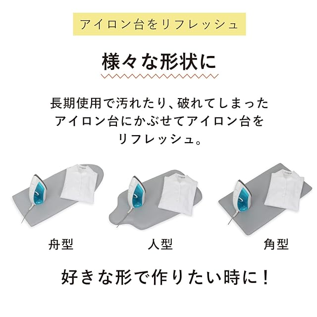 【アイロン台をリフレッシュ】:長期使用で汚れたり、破れてしまったアイロン台にかぶせてアイロン台をリフレッシュ。