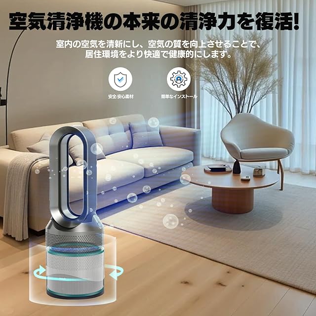<h2>ダイソン ホットアンドクール対応 高品質互換フィルター</h2> <p>このフィルターは、ダイソン ホットアンドクールシリーズに適合する高品質な互換品です。温風と冷風の両方で使用可能な空気清浄機能付き扇風機に対応しています。純正品ではありませんが、同等の性能を提供し、室内の空気をしっかりと浄化します。</p> <h3>【パッケージ内容】</h3> <ul> <li>空気清浄機フィルター 1個 (高品質互換品)</li> <li>お手入れ用ブラシ 1本</li> <li>日本語取扱説明書 1冊</li> </ul> <h3>【適合機種】</h3> <p>以下のダイソン製品に対応する互換フィルターです:</p> <ul> <li>Dyson Pure Hot + Cool Link HP03WS / HP03IB</li> <li>Dyson Pure Hot + Cool Link HP02WS / HP02IB</li> <li>Dyson Pure Hot+Cool HP01WS / HP01IB</li> <li>Dyson Pure Hot+Cool HP00WS / HP00IB</li> <li>Dyson Pure Cool Link DP03WS / DP03IB</li> <li>Dyson Pure Cool Link DP01WS / DP01IB</li> </ul> <h3>【交換時期の目安】</h3> <p>フィルターの交換時期は約1年が推奨されます。使用状況や環境によって異なる場合がありますので、適切なタイミングで交換してください。ペットがいるご家庭では、フィルターの寿命が短くなる可能性があるため、早めの交換をお勧めします。</p> <p>このフィルターはダイソン純正品ではありませんが、高品質な互換品として設計されています。空気清浄機能付き扇風機の性能を十分に引き出し、快適な空間を保つための優れた選択肢です。</p>