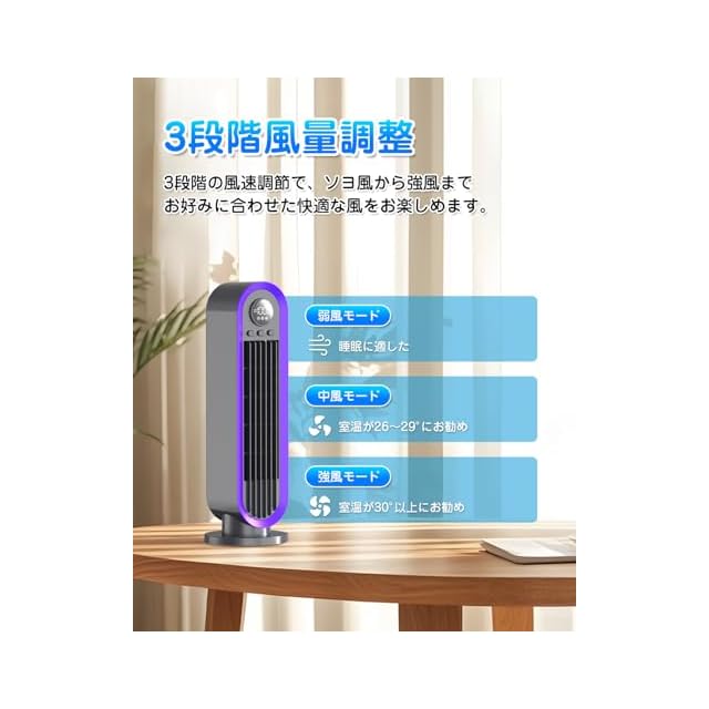 【羽なし安心設計・省スペース】ブレードを回転させることなくさわやかな空気の流れを届けることができるこのテーブルタワーファンは、子供やペットのいる家に欠かせない理想的な夏です。 その上、送風口は格子の幅が狭くルーバーに触れない安全な設計になっています。また、置き場所に困らないスリムなタワー型で、扇風機ヘッドの背面に取っ手付きもあり、料理をしているときはキッチン、就寝時はベッドのそばなど、シーンに合わせてあらゆる場所にスッキリおさまり心地よい風を送れます。