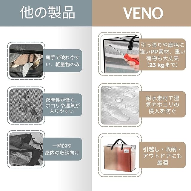 【頑丈で耐久性抜群】VENO布団収納袋は、強固な構造で最大23kgまで収納可能。耐破れ性にも優れています。十字縫いの強化ハンドルは破れにくく、ウェブエッジデザインで強度と耐久性を確保。スムーズに開閉できるデュアルタブジッパーで、中身が落ちるのを防ぎます。