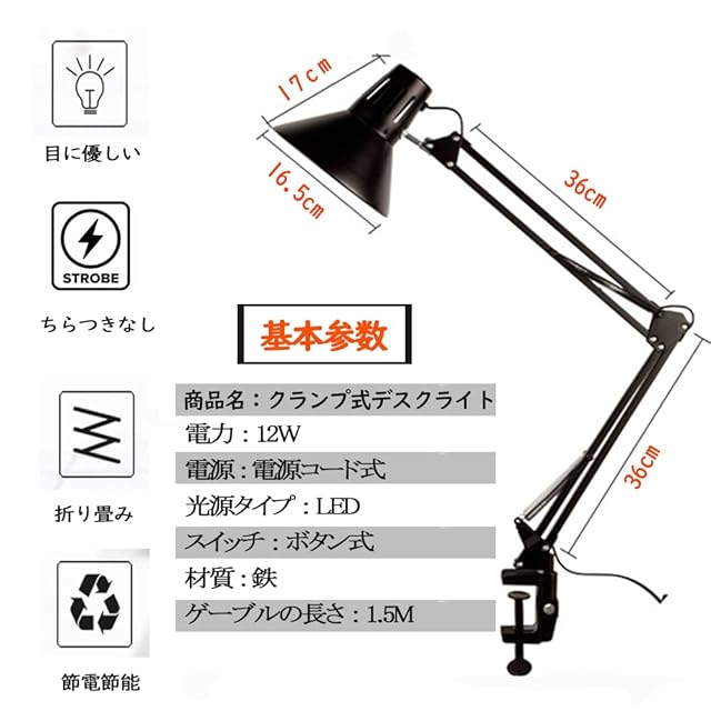 【多関節角度調整・省空間】360°の回転と180°の角度調整ができるシェードと自在に伸縮するアームで、照らしたい場所を自由自在に調整いただけます。省空間なクランプ仕様なデスクライト、固定するにも手軽くて、女性でも簡単に締め付けます。クランプ部分はABS製でしっかり出来上がって、4.5cmまで挟まれます。折りたたみ式の設計より、デスク用ライトをテーブルの側に沿って収納されることができ、空間節約に最適です。
