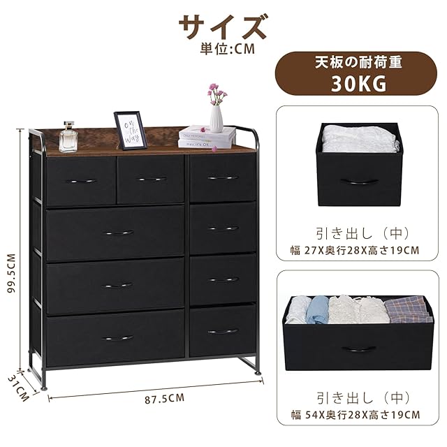 抜群の収納力: 2種類のサイズに分ける多機能収納ボックス。見た目はシンプルだけど、9つの引き出しもあり、収納力抜群です。アクセサリ、ファイル、おもちゃ、お菓子などから、バスタオル、冬着など大いものまで、たっぷり収納できます。天板に鍵、コップ、花瓶、写真などが放置できます。 安定した構造:タンスの脚部にアジャスターが付いており、高さが調整できる機能があり、床を傷つけるのを防ぎます。転倒防止も十分に考慮されており、ご家庭でも安心してお使いいただけます。1.5CM*1.5CMでのフレームやX字補強ワイヤー構造で安定感がUP!