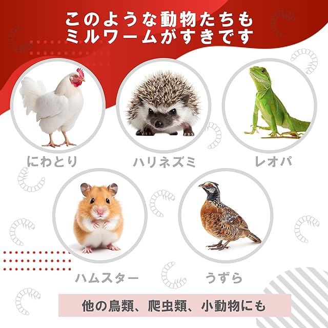 【高い栄養価値】乾燥ミルワームはタンパク質、ビタミン、ミネラルが豊富で、小動物・鳥・爬虫類・観賞魚の理想的な餌として有名です。定期的に与えると動物たちの免疫力を高め、健康をサポートできます。冬場のひなや鳥にとっては必須の栄養源です。ミルワームを鶏に与えると、良質な卵を産むことができます。また、爬虫類に与えると脱皮時の栄養を補い、スムーズに進行できます。