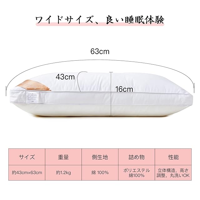 【標準サイズ、高さ調節可能】サイズ:43×63cm。重量:約1.2kg。ワイド幅で寝返りを打っても頭が落ちにくくて、国内の枕カバーに合う使いやすい標準サイズです。ポリエステル100%の詰め物とシャツのようなさらっと肌触りの100%綿の側生地の組み合わせによって生まれた枕です。しかも期待の第二代で高さを調節することが可能です!ファスナーを開けて、綿の出し入れでお好みの高さで調節してください。
