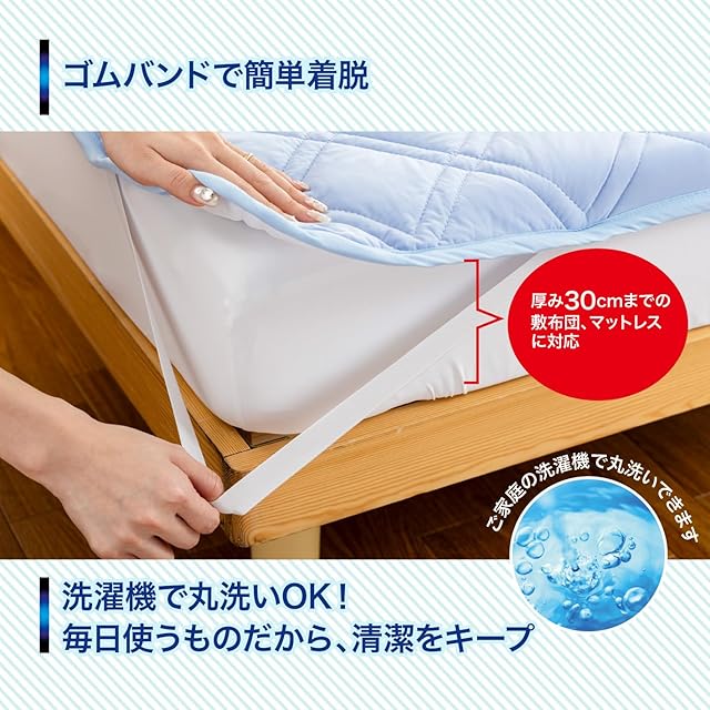 ✅【ズレずにしっかりフィット】四隅ゴムバンドでズレにくく、マットレスにも敷布団にもぴったりフィット。30cm厚まで対応し、ひんやりマットの冷感をしっかり体感できます。就寝中の寝返りにも動じず、敷パットとして安定した使い心地を実現しています。