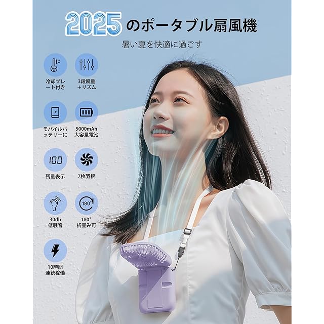商品名:Azinol ハンディファン 冷却プレート ハンディ扇風機 (2025超強風 瞬間冷却 手持ち/首掛け/卓上/モバイルバッテリー/スマホスタンド5WAY) 小型 強力 風量3段階 リズム風搭載 5000mAh大容量 長時間連続運転 電池残量液晶表示 type-c 折りたたみ式 軽量 持ち運び便利 ストラップ付き アウトドア 熱中症対策 (ラベンダー)