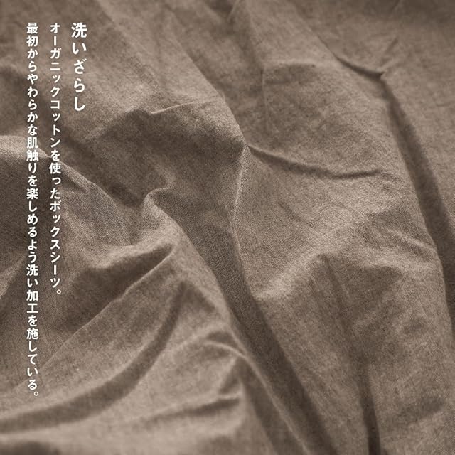 【オーガニックコットン洗いざらしの綿100%】:デニムの色として人気のインディゴブルー、洗いざらし仕上げにより最初から肌になじむように仕上げました。洗濯後のシワも味わいになる洗いざらしの綿です。洗いざらし綿はまるでお洋服のようで、使い込んだ綿だけが持つ風合いに、肌に優しくなじむ柔らかな肌ざわりです。