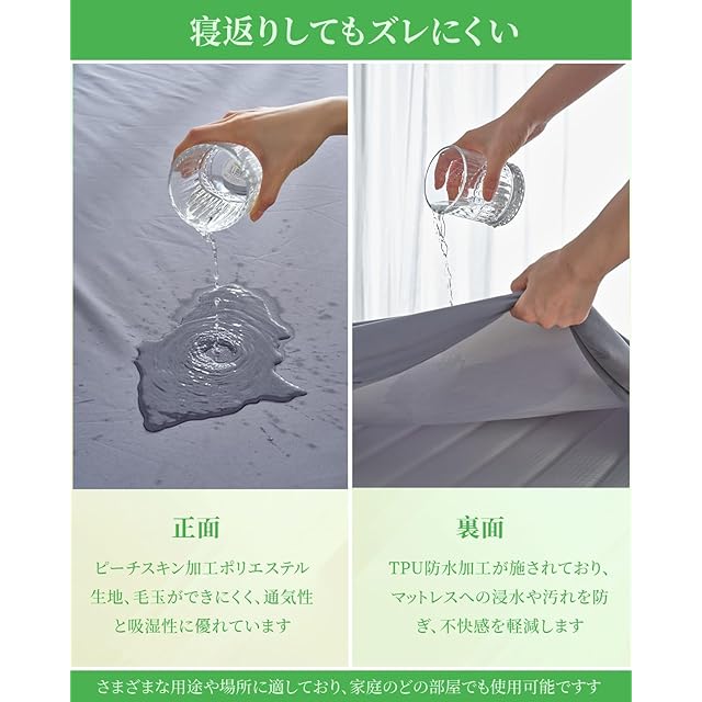 【4. 簡単着脱&ズレ防止設計で使いやすい】全周にゴムが施されたボックスタイプのデザインで、約15秒で簡単に着脱が可能です。マットレスの厚さ30cmまで対応し、よく寝返りをしてもズレにくい設計です。どんなサイズのマットレスにもフィットし、お子様や高齢者の使用にも適しています。快適で手間のかからない設計が日々の使用をさらに便利にします。