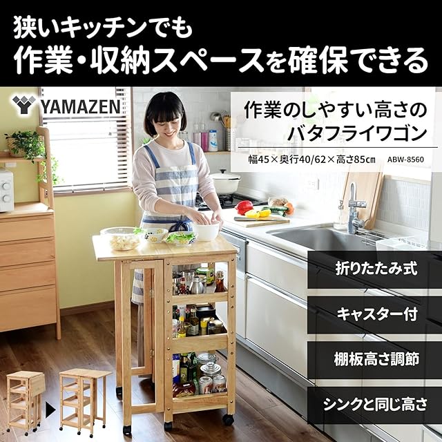 山善(YAMAZEN) ワゴン キャスター付き 3段 (折りたたみ) キッチン 作業台 幅45×奥行40/62×高さ85㎝ 棚板高さ調節 バタフライ テーブル 調味料ラック 組立品 天然木 ABW-8560(NA)