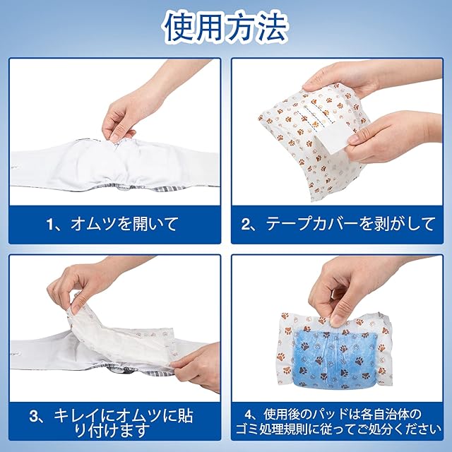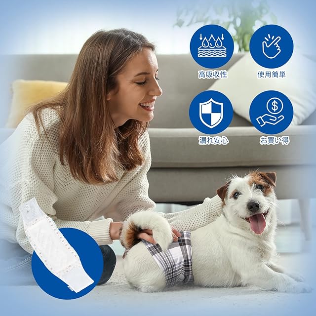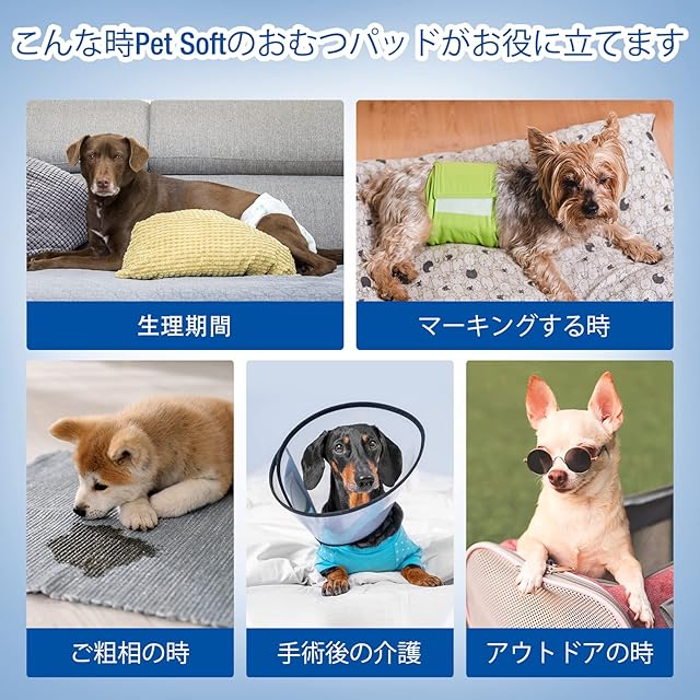 商品名:犬用おむつパッド 男の子 女の子兼用マナーパッド 100枚入 おむつウェア マナーベルト サニタリーパンツに適用、ズレない 高吸収性能 蒸れない お漏らし対策 マーキング対策 手術後介護 老犬介護 おむつパッド