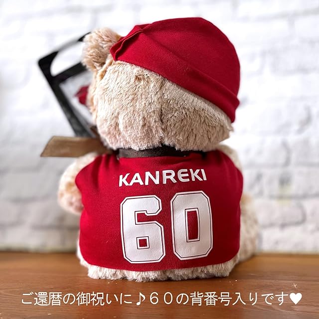 【仕様】赤のベストと帽子のくまさんと、プリザーブドフラワーの赤バラをセットにした、還暦祝いのギフトです。60歳の御祝いにちなんだ「60」の背番号入り。還暦のお祝いメッセージを記したカード付き。