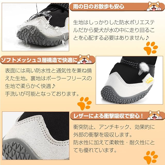 商品名:「SENMUUP」犬靴 犬用ブーツ ドッグシューズ 春夏用 軽量通気 メッシュ 抗菌防臭 吸水速乾 2重ストラップ 履かせやすい 脱げにくい 肉球保護 滑り止め 耐久性ゴム底 散歩 雨の日 防水 介護 傷舐め防止 夜間反射テープ付 小&中&大型犬 8サイズ 4個セット (ブラック, 1#)