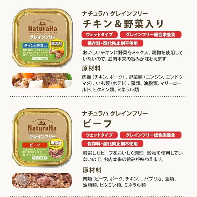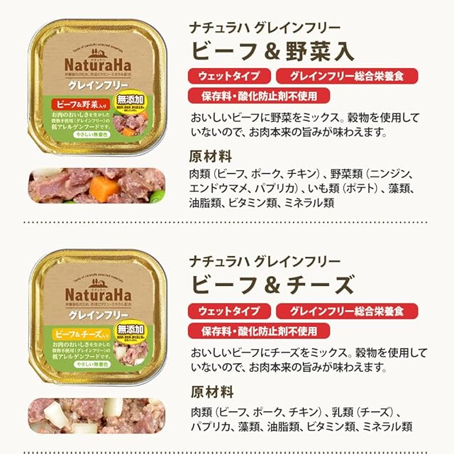 [ナチュラハ グレインフリー 犬 チキン&野菜入り] 保存料・酸化防止剤無添加、グレインフリー(穀物不使用)で作ったウェットタイプの総合栄養食です。 おいしいチキンに野菜をミックス。 [ナチュラハ グレインフリー 犬 ビーフ&チーズ] 保存料・酸化防止剤無添加、グレインフリー(穀物不使用)で作ったウェットタイプの総合栄養食です。 おいしいビーフにチーズをミックス。