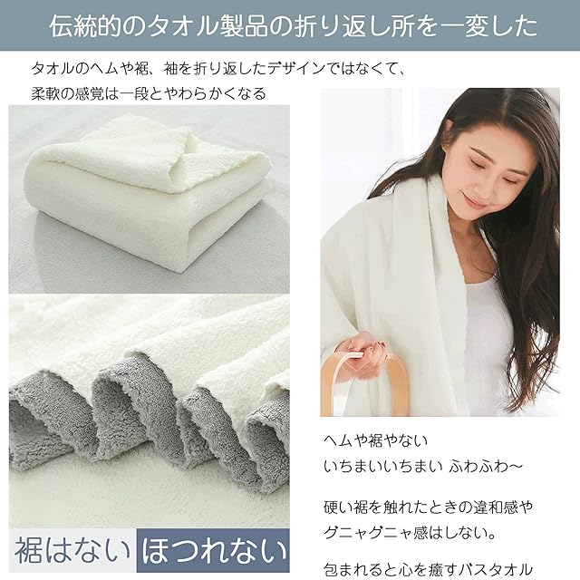 【抜群な吸水力】マイクロファイバーで作られていますので、吸水力は綿より3倍以上優れるところは誇りになる性能を持つ。繊維に多くの隙間があり、直径8マイクロメートル以下、髪の毛の100分の1以下という細さで素早く水を吸収します。なめらかな手触りと吸水性能と速乾性能の速さがかがやくポイント。身体を包み込むように羽織るだけでしっかり吸水します。