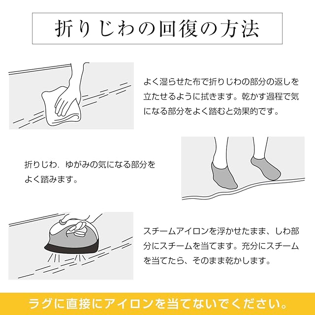 【滑り止め・抗菌・防ダニ加工】衛生的にお使いいただけるよう、抗菌・防臭・防ダニ加工を施しています。ラグの裏面にはゴム製の滑り止め加工を施し、フローリングに敷いても滑りにくく安心です。また、ノンホルム仕様なので、お年寄りやお子様、ペットがいるご家庭でも安全にお使いいただけます。